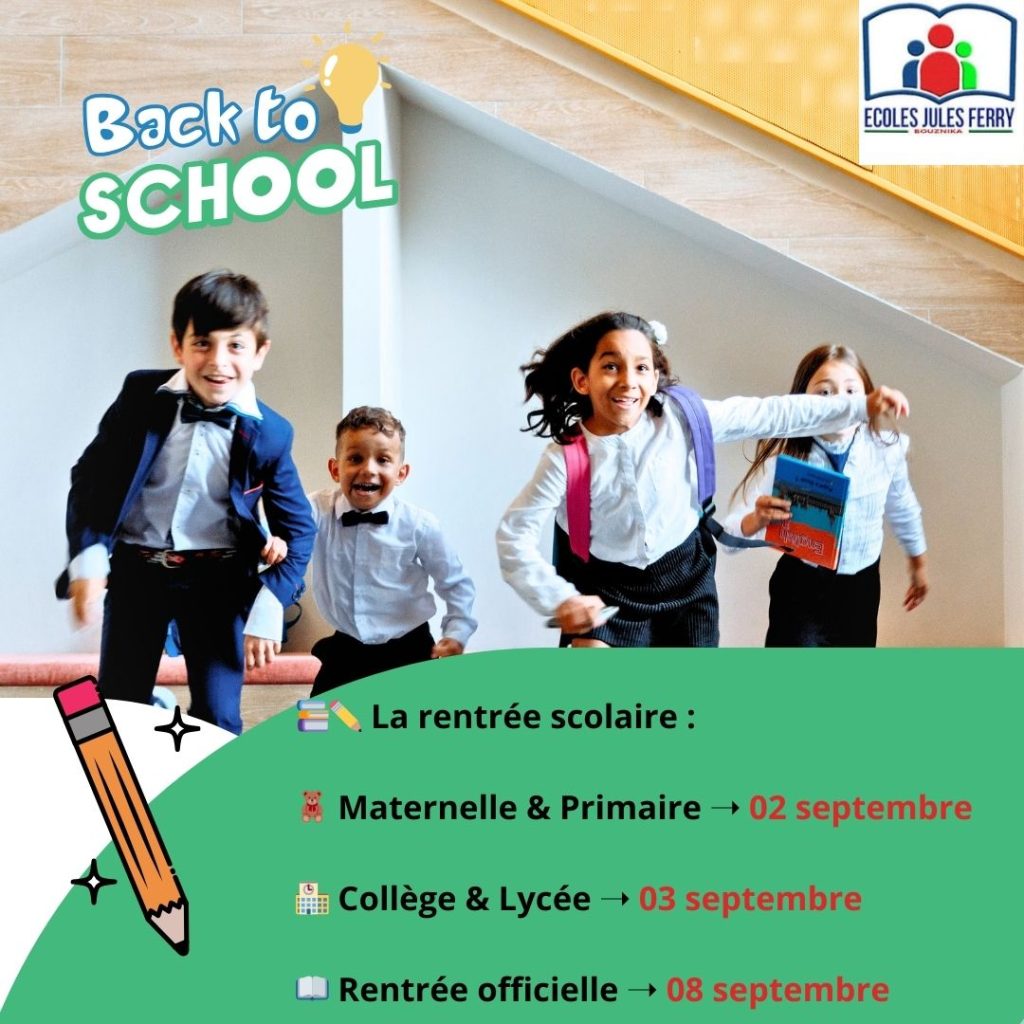 Nous sommes ravis de vous annoncer les dates officielles de la rentrée scolaire 2025-2026 au sein du Groupe Scolaire Jules Ferry Bouznika: